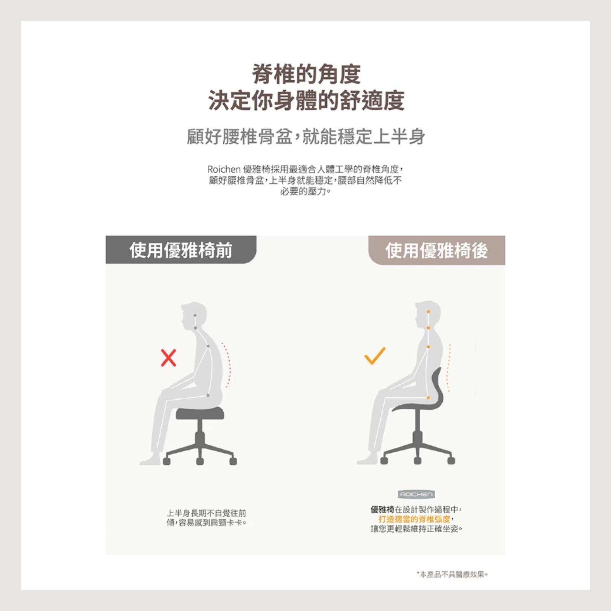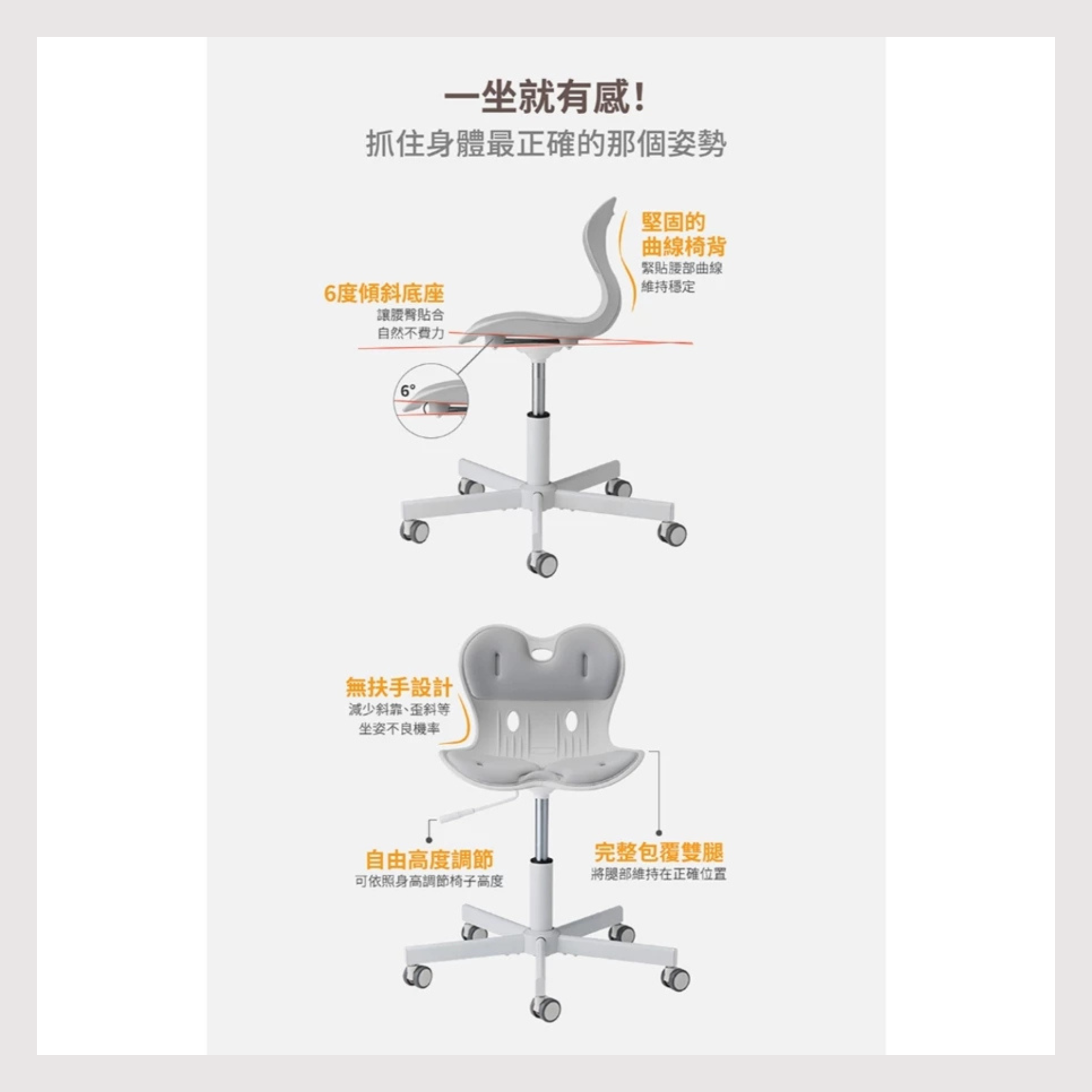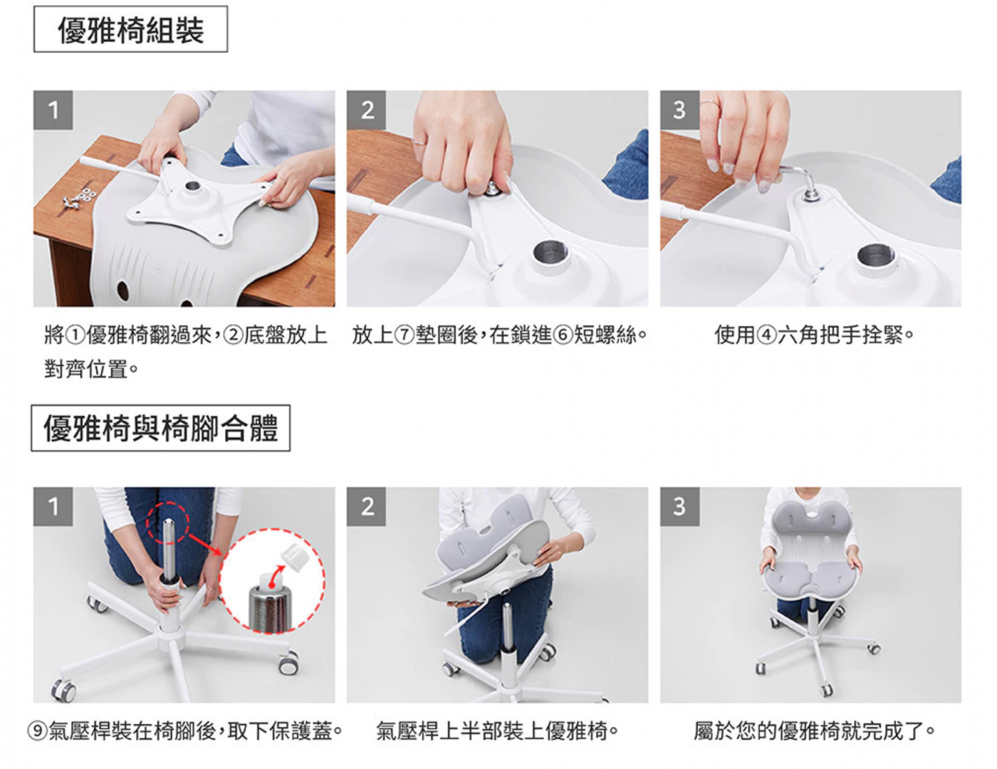 如果刻意用力往後仰會有受傷的可能性。 優雅椅為可滑動的椅子,為了安全,使用身高盡量以可以坐上後,腳可以接觸地面的身高為主。 本產品非醫療器材,並無醫療效能。 在組裝前記得將氣壓桿上的保護泡棉取下。 建議您收到後,先隔著包裝試坐優雅椅座墊是否合適,沒問題再行組裝椅腳。 優雅椅底座、椅腳一經組裝後,就不在退換貨範圍之內(瑕疵商品不在此限)。 配送地點僅限於台灣本島,外島地區(澎湖、金門、馬祖、綠島、小琉球)無提供服務,敬請見諒。