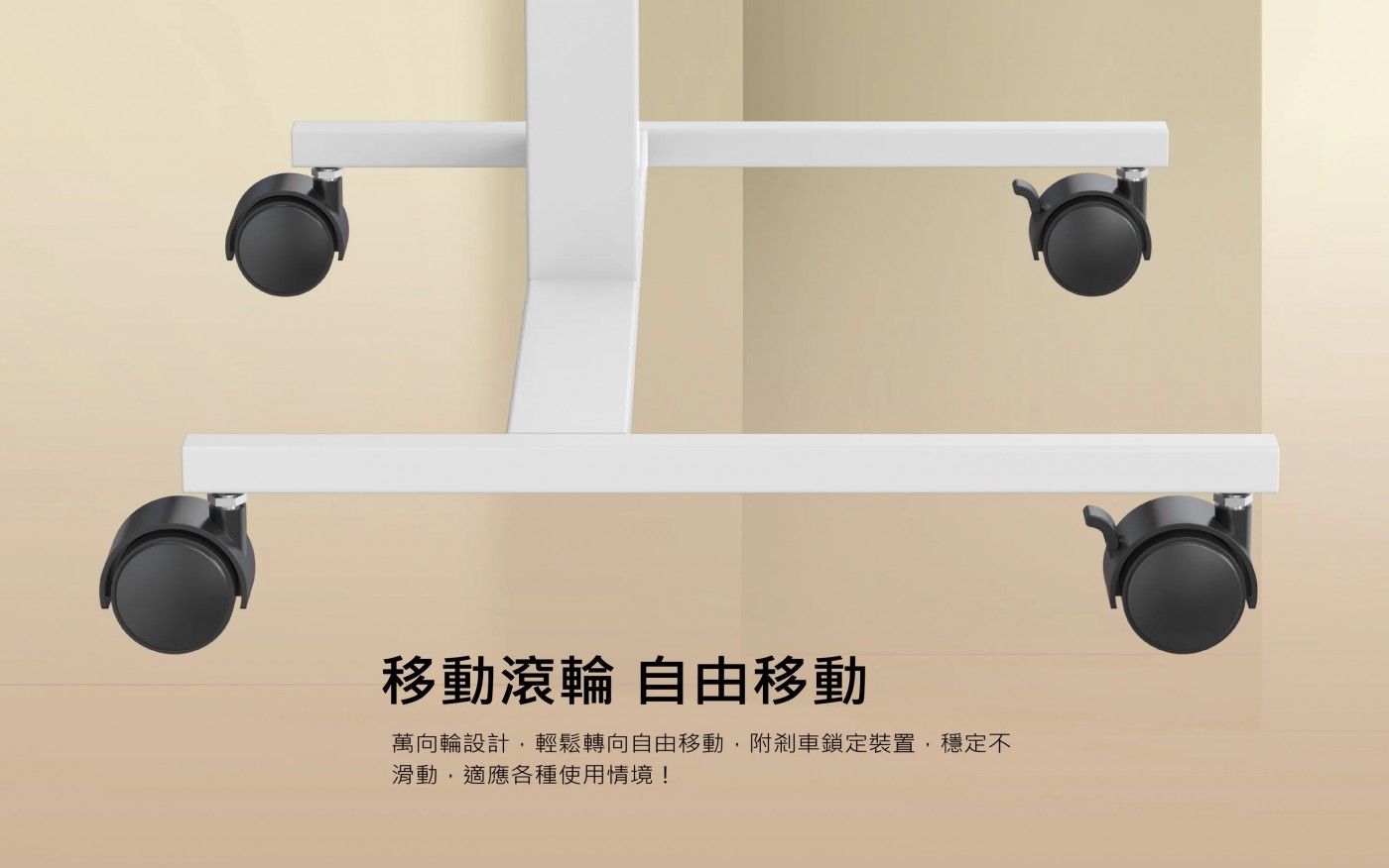 14. 桌子帶有四個萬向靜音輪子,方便隨處移動,且兩個輪子能夠煞車固定,辦公時不易滑動